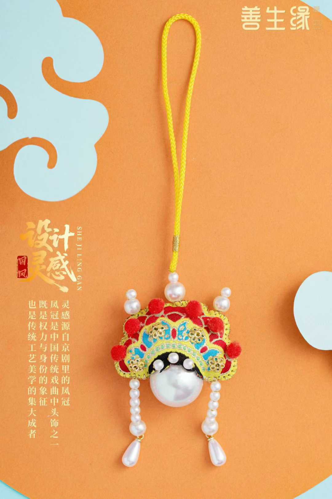 以京劇旦角鳳冠為原型,提取其標誌性元素進行意象化轉譯 ——將鳳冠紋樣的簡化為刺繡的蝴蝶紋理,羽翼舒展如花瓣;冠上的珍珠絨球化作香薰頂部的紅色絨球點綴,立體感十足;鳳冠的鎏金飾片抽象為香薰表面的鍍金花鱗,精緻且好看。整體造型摒棄鳳冠的繁複層疊,以半月形輪廓呼應冠飾的弧線美感,開合處綴以大珍珠,既保留戲曲服飾的華貴基因,又適配日常佩戴的便攜性。